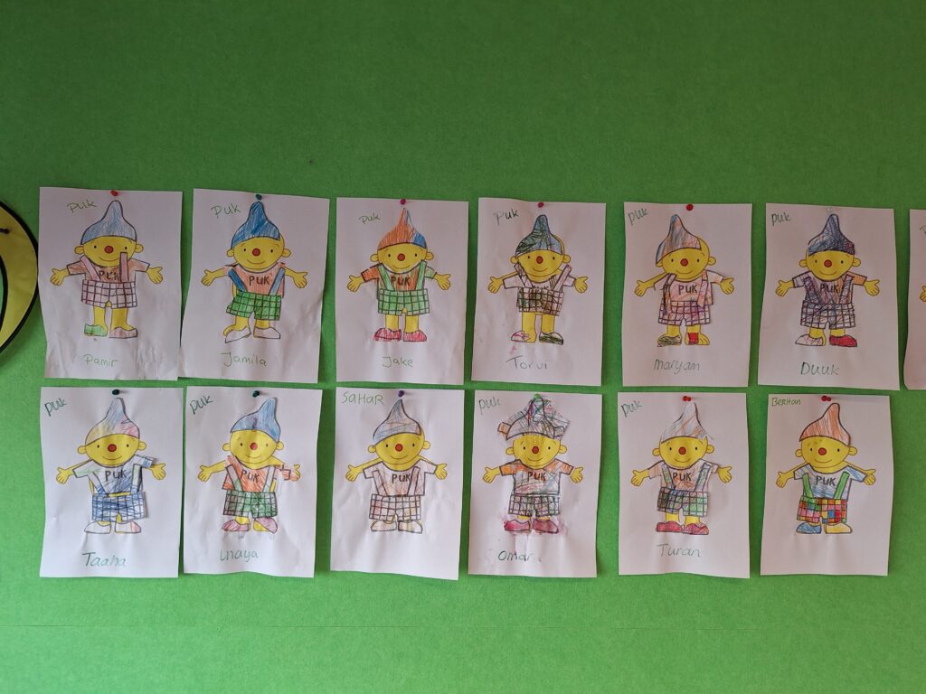Op de groepen kunt u de werkjes bewonderen en op het prikbord hangt er een overzicht van wat we komende week gaan doen. Ook de woordkaarten hangen op de deur, een kopie voor mee naar huis mag altijd. Dan kunt u thuis ook oefenen met Nederlandse woorden en inspelen op wat wij hier met de kinderen doen.