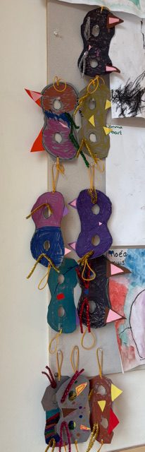 Op de foto is de tekening van Sophia uit groep 1/2A te zien en de dierenmaskers van groep 2A.